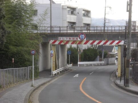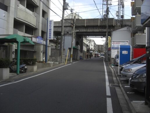 下川原に入り、阪急線の高架手前で西新道の自動車道に合流し左に折れて、阪急線の高架を潜る