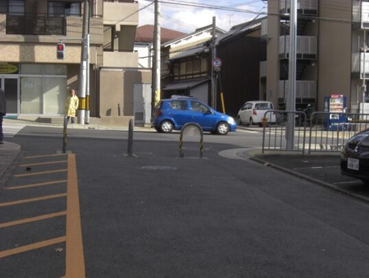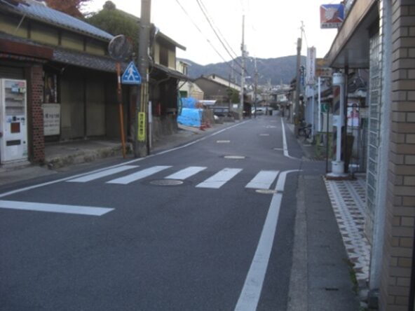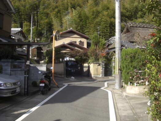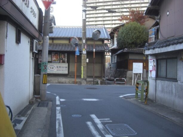 十字路から下ってきた桂川方向を見て左に曲がる角に