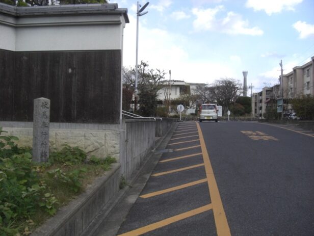 その先で街道は六差路の交差点に差し掛かる。交差点の左(東)へ曲がり真っ直ぐ進む