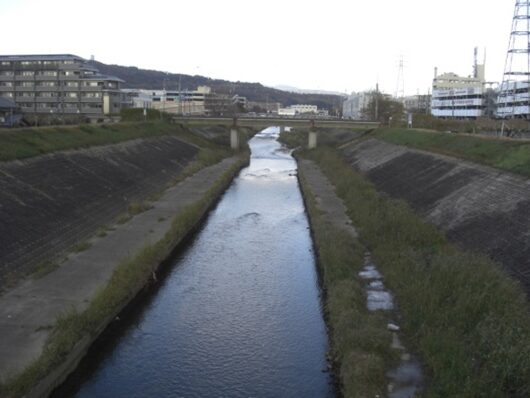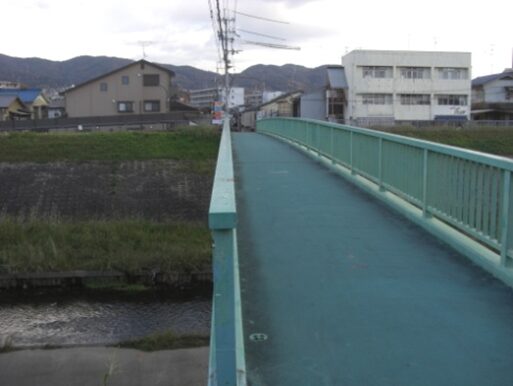 学校が切れた先で西羽束師川の長権堂橋を渡り、一旦新道に合流する