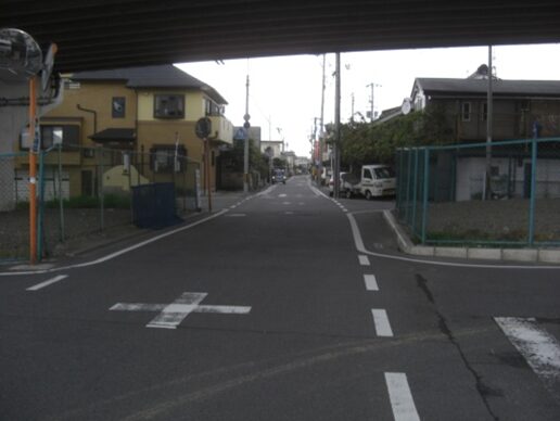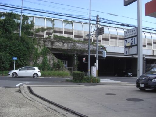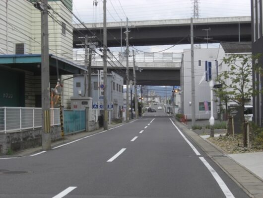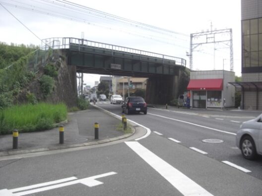 下川原に入り、阪急線の高架手前で西新道の自動車道に合流し左に折れて、阪急線の高架を潜る