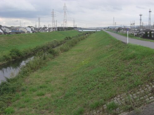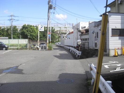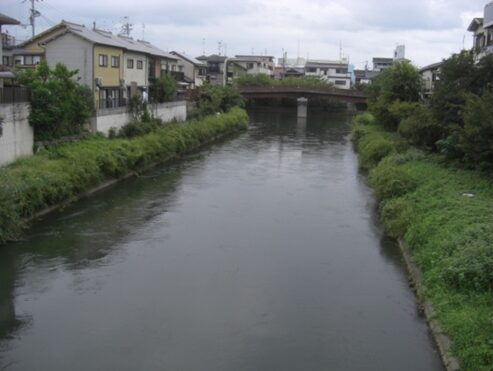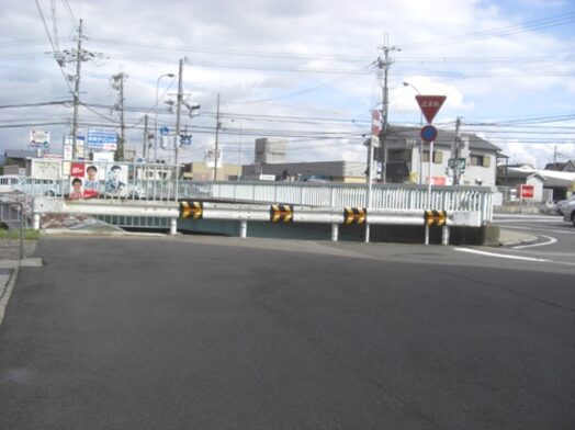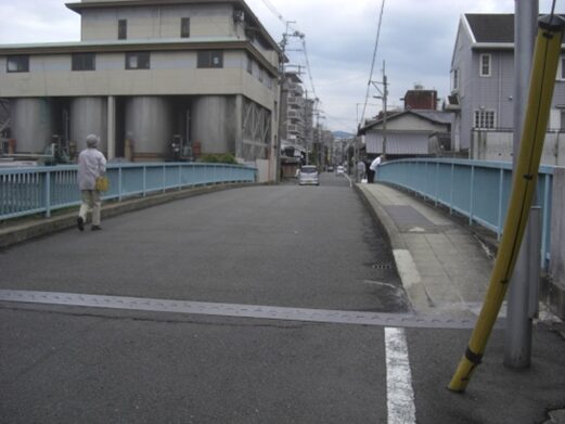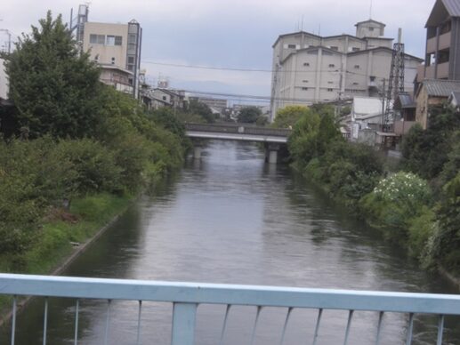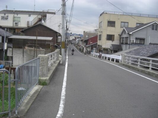 学校が切れた先で西羽束師川の長権堂橋を渡り、一旦新道に合流する