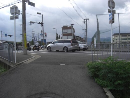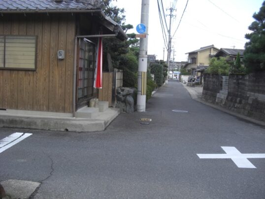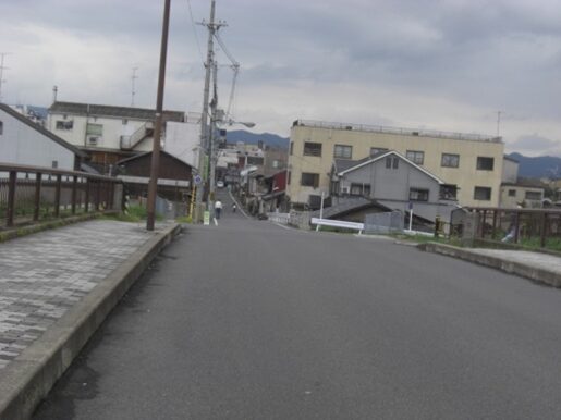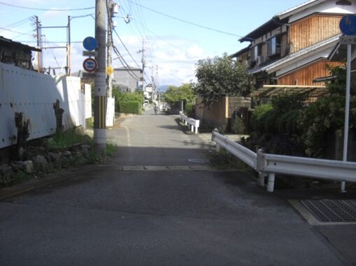 十字路から下ってきた桂川方向を見て左に曲がる角に