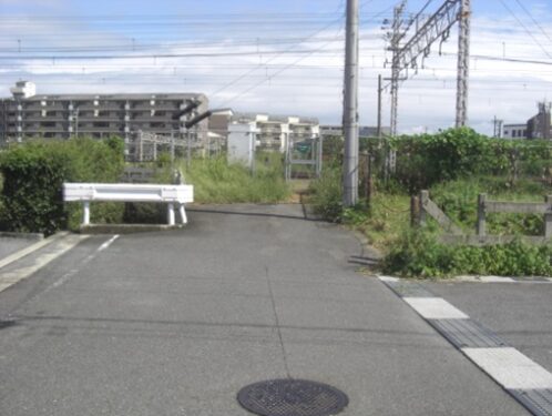 萬福寺のすぐ先でT字路を左に折れるとすぐ東海道線に突き当たる。以前は踏切があった痕跡があるが廃止されており、右に迂回して線路の向こう側に出る