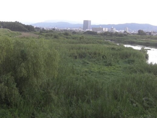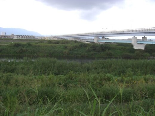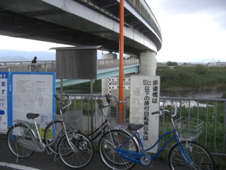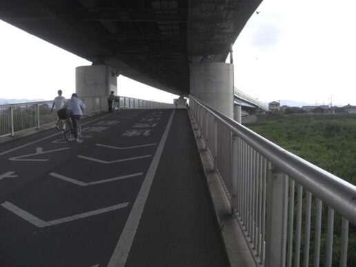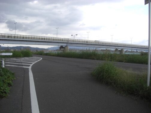 前方に外環状線の新道の新橋がある、その下を羽束師橋が架かっているので迂回し桂川を渡る