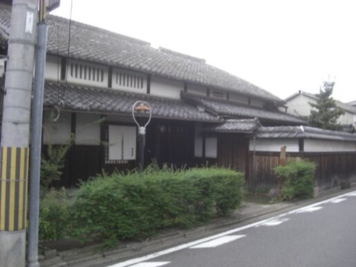 右に折れる所から、歩いてきた旧家が建ち並ぶ街道景色を振り返る