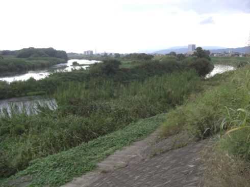 その先で桂川の堤防に行き当るので、道は左にカーブ