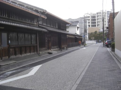 突当りの右の街並みも旧家の味わい深い建物が並ぶ