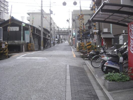 京阪本線の踏切に出る右に  踏切を渡ると左に伏見桃山駅