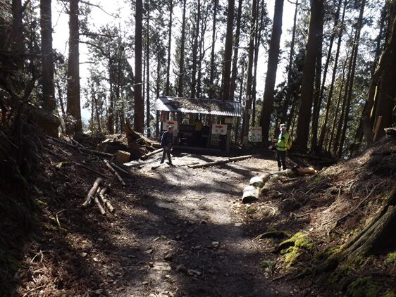 愛宕街道を歩いたところの愛宕神社表参道と水尾の里への分岐点です。上から見たところで、左へは登山口方向へ下る道で、右が今回歩く水尾の里への下る分岐道です