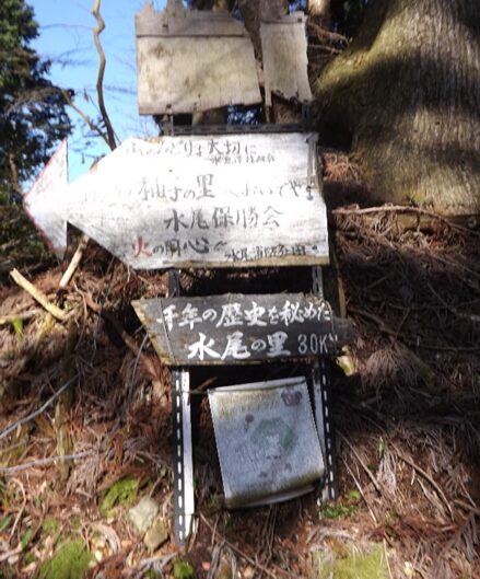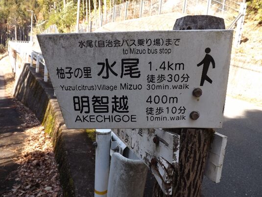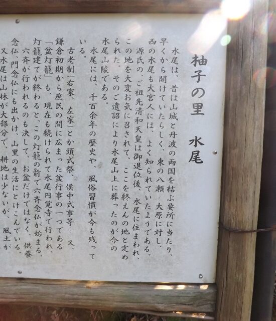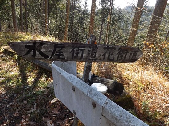 水尾街道花街道の標識が立っています。かつては人里離れた集落で交通の便は少なく、車でないと行き来は大変です今では道も整備され舗装道です