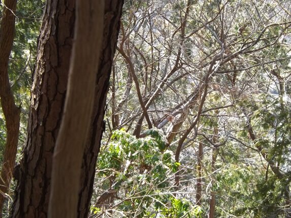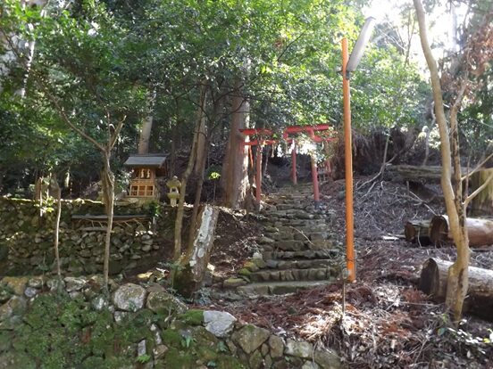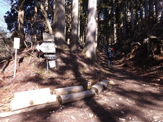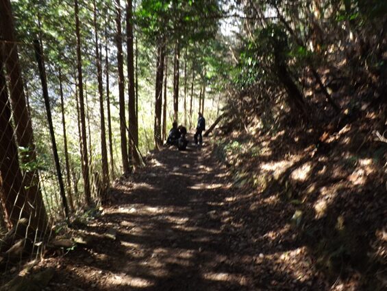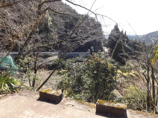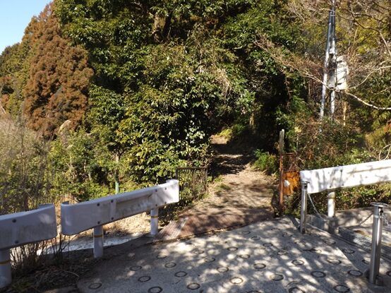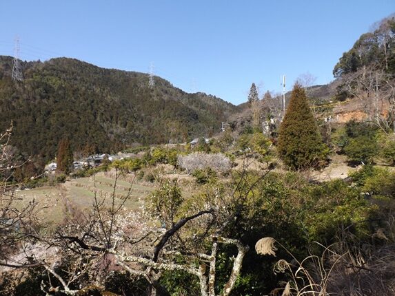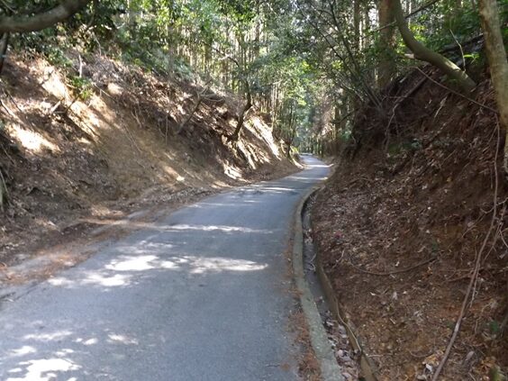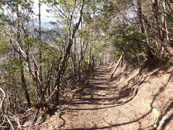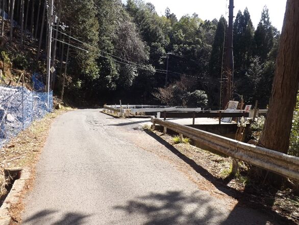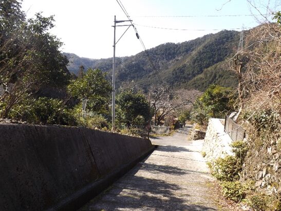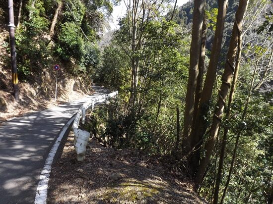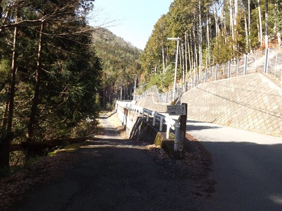 舗装道の右真下、谷川に沿って道があります。このあたりに丸太橋がかかり、亀岡城下への 明智越えの古道 があります。(明智越えは以前に歩いています、2013年3月17日詳細はご参照ください)