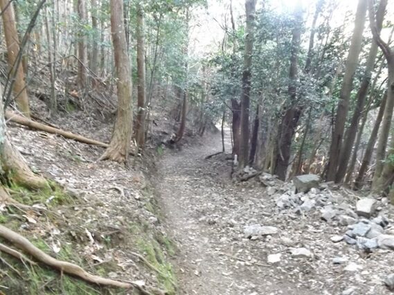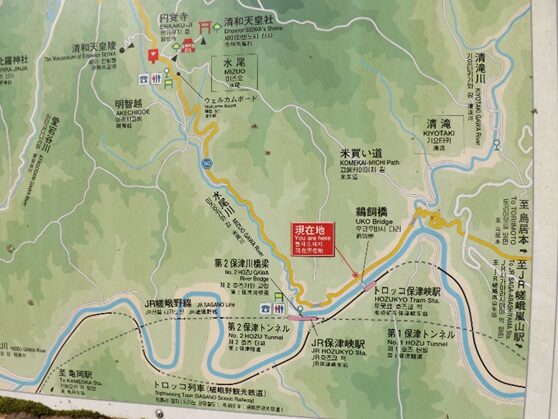 愛宕山から水尾の里を経由して、ここ明智越えとの合流点に出たところで、引き続き保津峡駅近くまで歩きその後保津川の左岸を北東に沿います。ひょっとしたら明智軍の一部隊がこの道を進み嵯峨から嵐山に抜けて、本能寺に合流したかもと想像しました。でも当時この付近に道があったかわかりませんし、歴史資料にも乗ってこないので多分私一人の仮説でしょう。保津川にそって進み、現在の落合橋を渡ったところで東に進み、結構急坂の蛇行を繰り返し、六丁峠を越えます。そして下って行ったところで嵯峨の鳥居本にでて愛宕表参道の愛宕街道に合流して嵯峨野を進み嵐山に出る道です