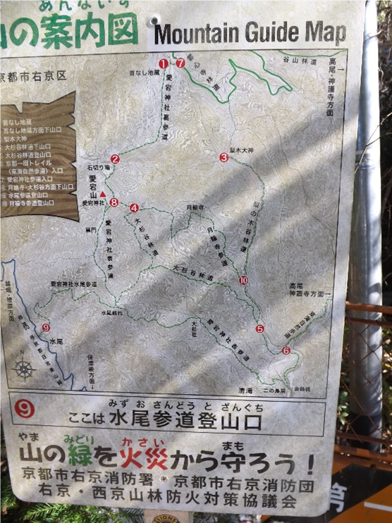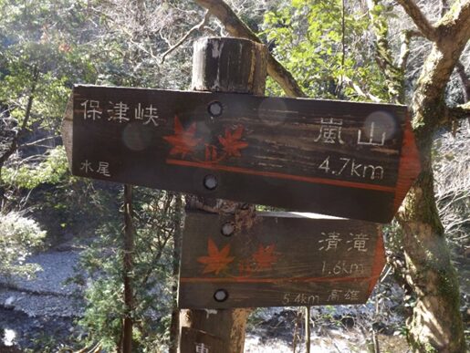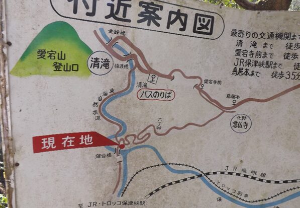 自宅早朝に出て京都嵐山へ、バスで愛宕山登山口の清滝まで。愛宕山表参道で山頂へ登り、山頂から少し下った分岐で水尾の里へ出ます。水尾の里から下り、明智越の入り口を右に見て更に下ってトロッコ保津峡駅に出て左保津峡に沿って愛宕山登り口の清滝へ、清滝から嵐山への道。特に街道名はついていません。