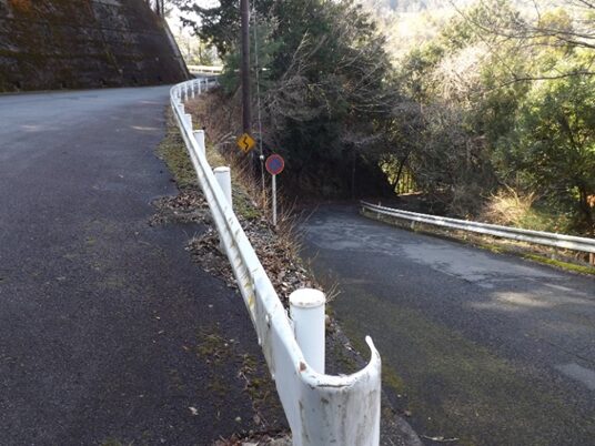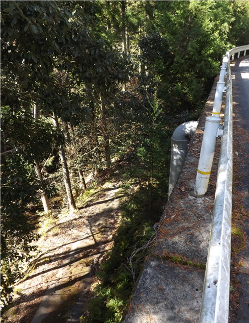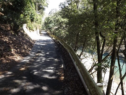 トンネルに入る手前の以前の旧道が残っています、右は急峻な保津川への崖です。