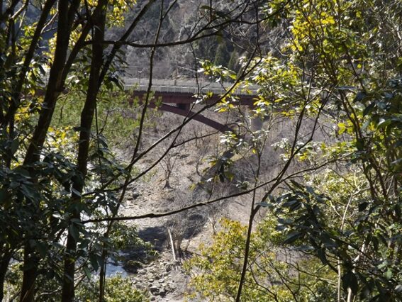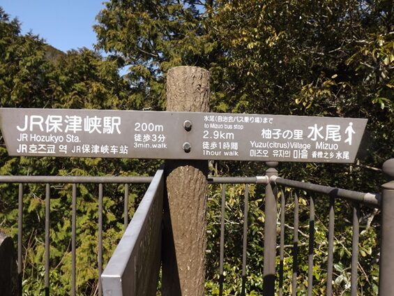 水尾の里から1時間余り歩くと赤い保津峡橋に出ます。橋を渡って左に折れていくとJR保津峡駅に出ます。私は橋の手前を左に折れます