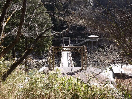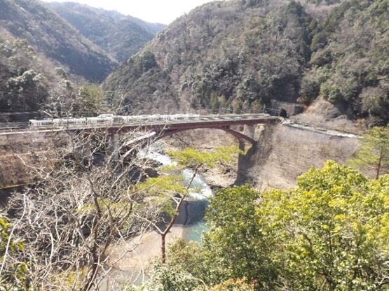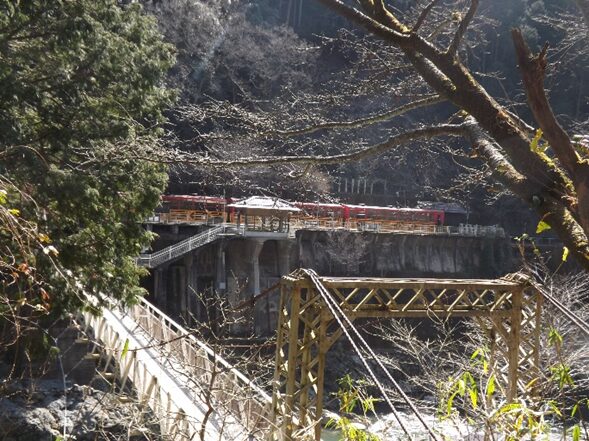 右手対岸にトロッコ保津峡駅が見えてきます、トロッコ保津峡駅に通じる橋
