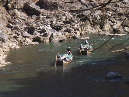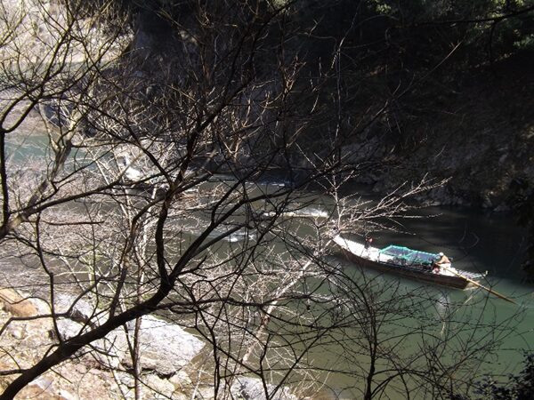 保津川の峡谷、流れが速いので舟は足先に進んでいます。JR線やトロッコ電車は向って右の山中をトンネルで進んでいます。JRは第一保津トンネルトロッコ電車は清滝トンネルです