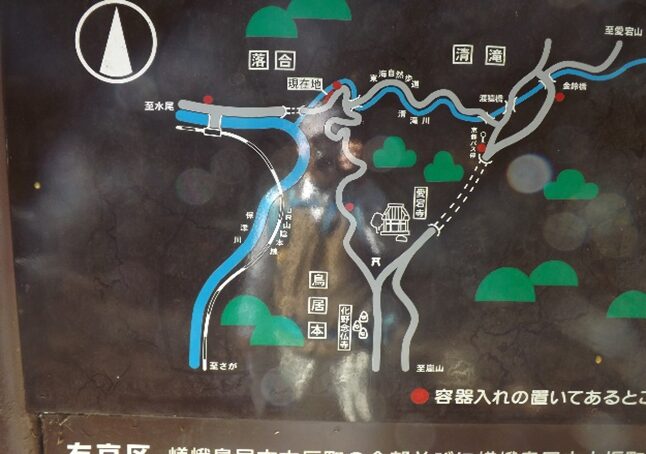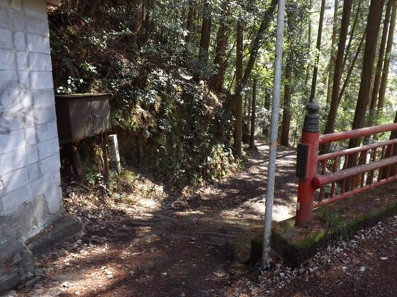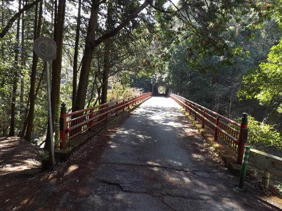 トンネルを潜ると保津川に注ぐ支流の赤い落合橋に架かる橋を渡ります。橋を渡ると右に下る道がありその左袂に