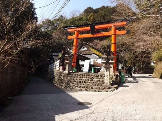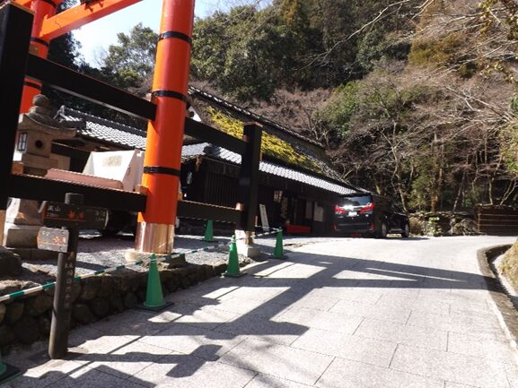 愛宕神社の一の鳥居に着きました 出てきたところを振り返ると向って左から出てきました。右は愛宕街道で清滝にでて愛宕山の参道に出ます
