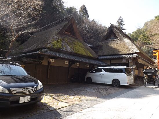 一の鳥居、傍にある 平野茶屋(鮎茶屋)茅葺の屋根歴史を感じさせる