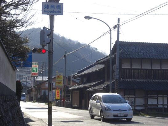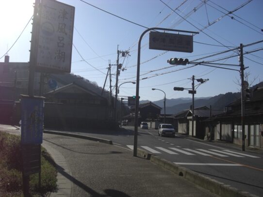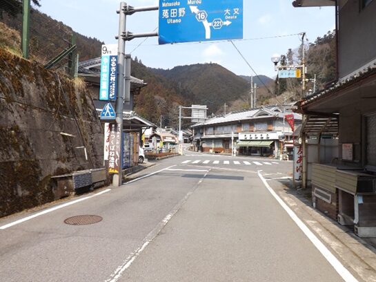 街並みが中程で十字路にでます 吉野路・万葉のみち はここを右折れして吉野川に架かる柴橋を渡ります。