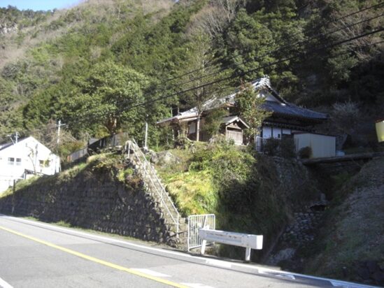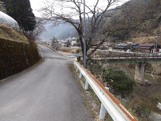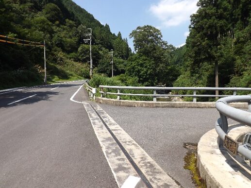 鷲家口からは暫くは現在の新道と重複していたようです。一の谷橋を越えて次の田川橋辺りで、鷲家川を対岸に渡っていたようで、その先は、鷲家川と新道を左に平行して右の山裾を、大矢橋、吉村寅太郎戦死の地の大岩を通り、鷲家の河合橋の右側に出ていたようです。