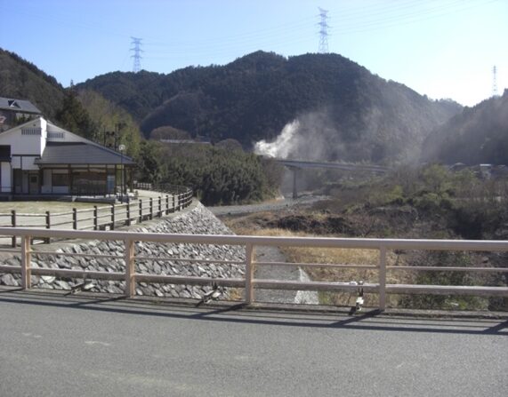 向かって右の道を下ってきた、右に中荘温泉があります