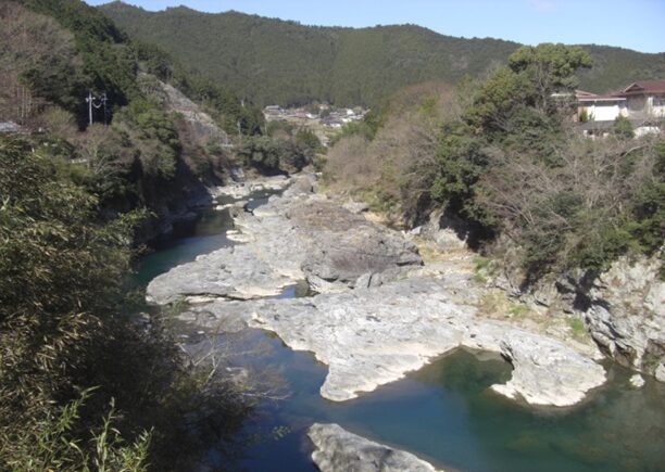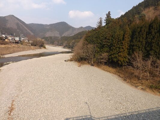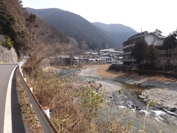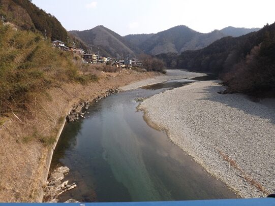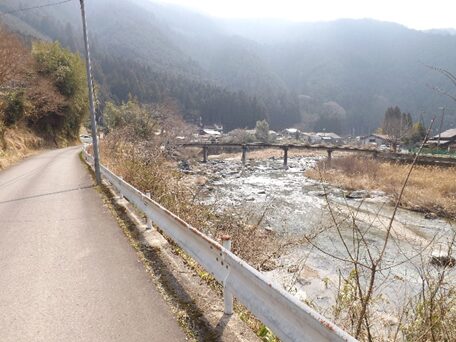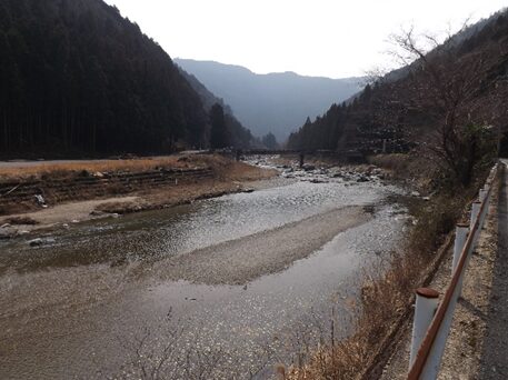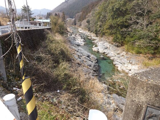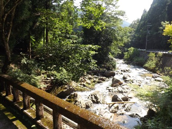この先の上流を見る、今でこそ道路改修でよくなったが、かつては山が両側に迫り吉野川の水の豊富な急流が流れその間に細い道がついていたのだろう想像ができる。