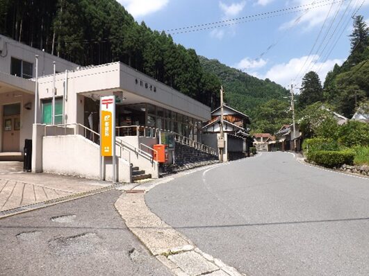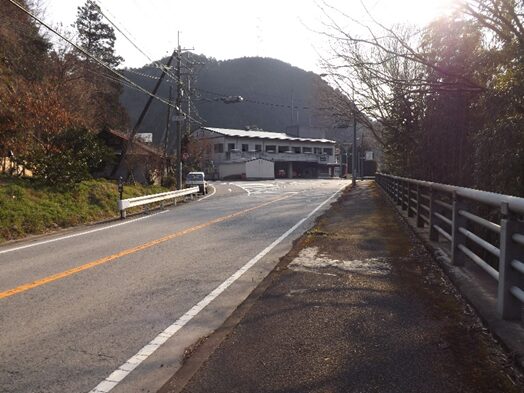 十字路を左に曲がり少し【寄り道】をする、左に曲がると、すぐ国道169号線の交差点にでます。左角に宮滝郵便局があります。東熊野街道はかつてはこの辺りから吉野川を渡り対岸に出ていたと思われます。現代はこの先の吉野広域消防本部で右に進んでいます。