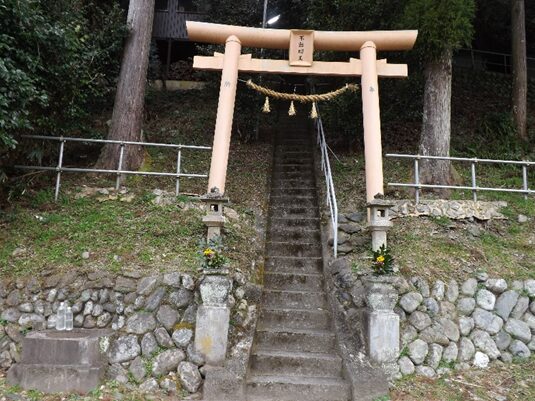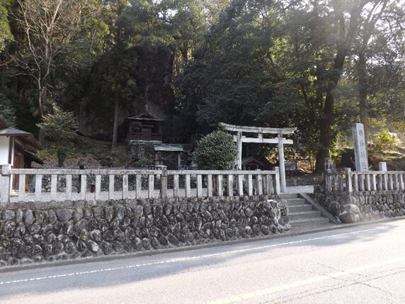 そこから200m程先左の山裾に岩上神社があります