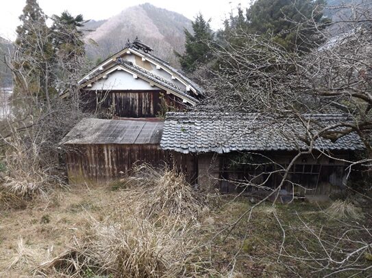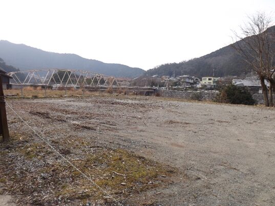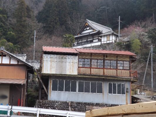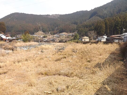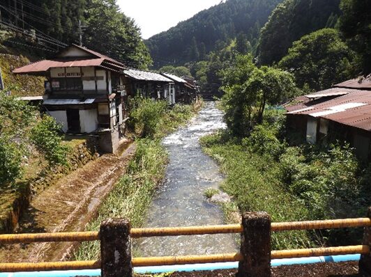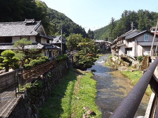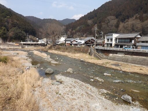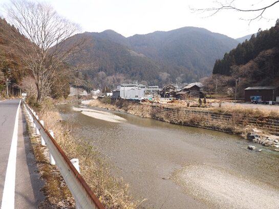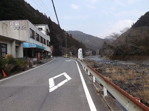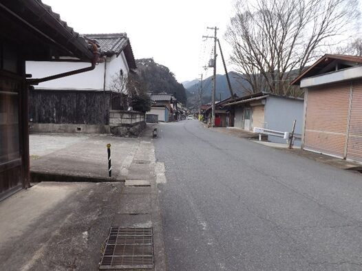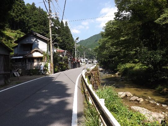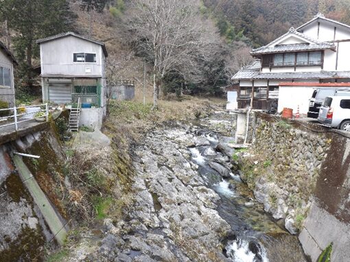 街道沿いに民家が並ぶ民家の裏は鷲家川