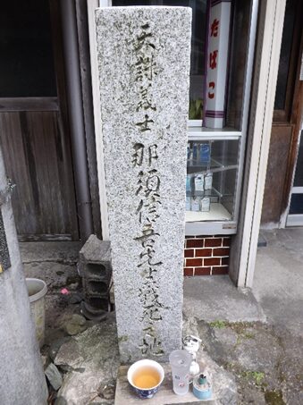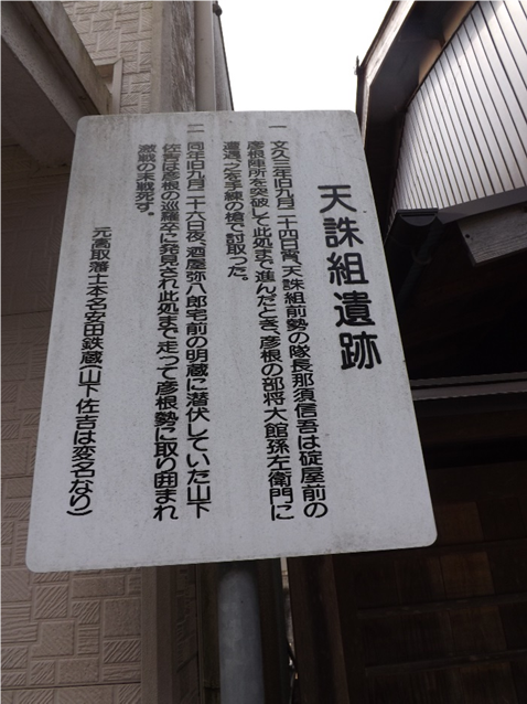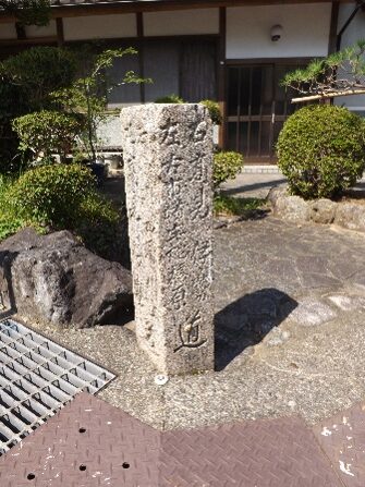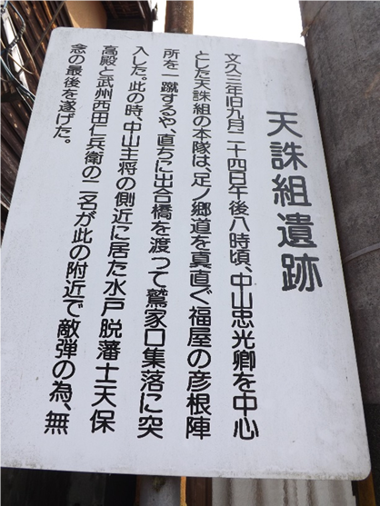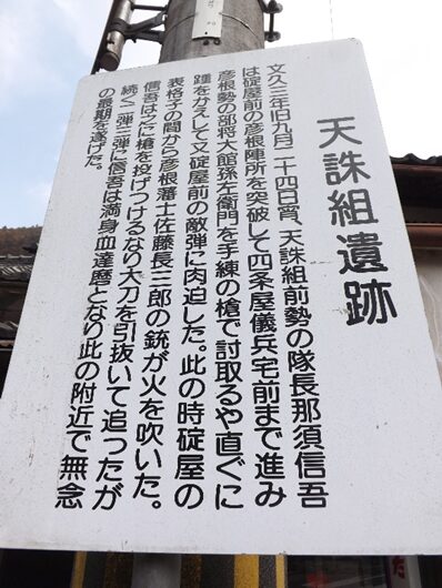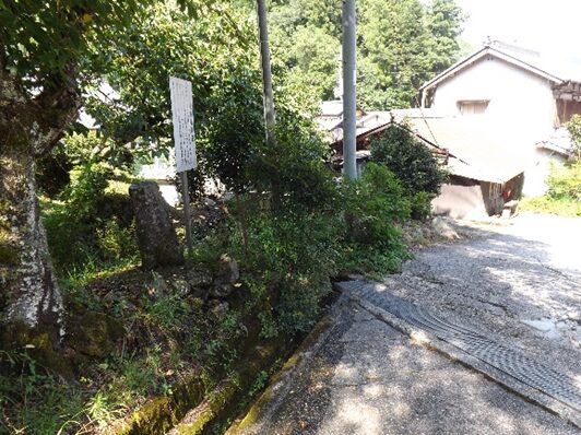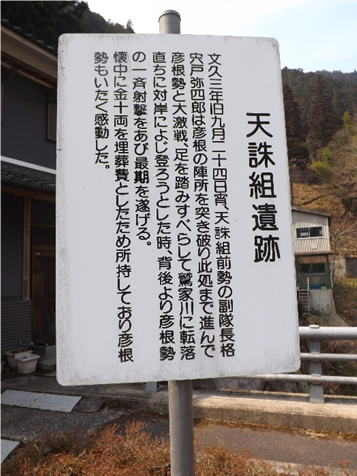 一の橋を渡ったすぐ左の民家角に、天誅組碑と説明板、九月二十四日宵、出店坂より敵陣に突入の途中、被弾した前勢の一人 鍋島米之助(土州産24歳)は、之に屈せず彦根の陣を突破してここまで進み辰巳家の納屋に潜入休息しが、翌朝、発見密告され駆け付けた藤堂勢の銃弾に斃れた
