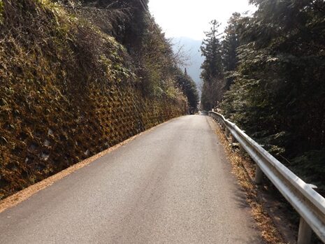 この国道は歩道が殆どない所に、大型車が多く歩くのには危険な道である。川向かいに道があるが古道ではないのでこちらを歩く。暫く歩くと、左斜めに坂を上る細い道が左の山麓にむかっているので一か八かその道を進む。ダメなら戻るだけである
