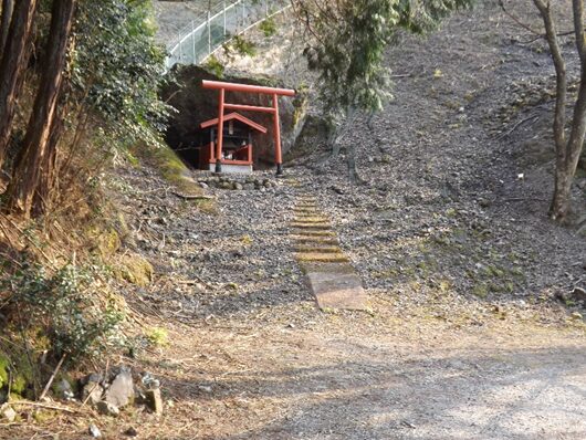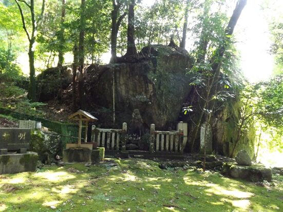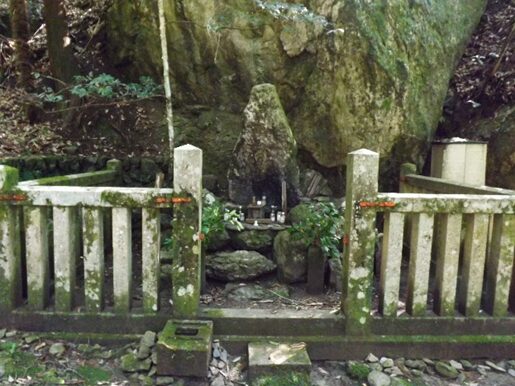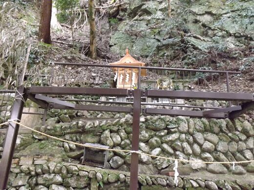 橋から左の岩盤の上に祀られている馬頭観音の 二基の祠