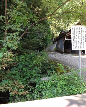 川向に添水があって、臼小屋があった。この下月尾の谷に沿った山道は、殿川から小名に出ている、そうず越え殿川道。同年九月二十一日午後二時半頃、足の郷峠を越して鷲家口に着いた天誅組記録方の伴林光平は、平岡鳩平(後の正二位男爵北畠治房)と西田稲夫の二名を伴い、鷲家口の若者六名とこの向かい下月尾谷を登り小名、三茶屋を経て宇陀に向かった。鷲家川と左の街道沿いの建物の裏側