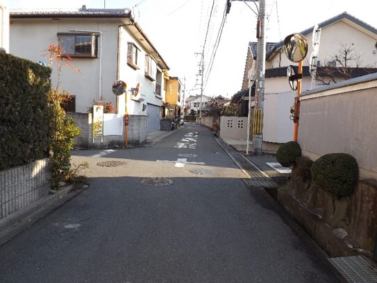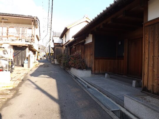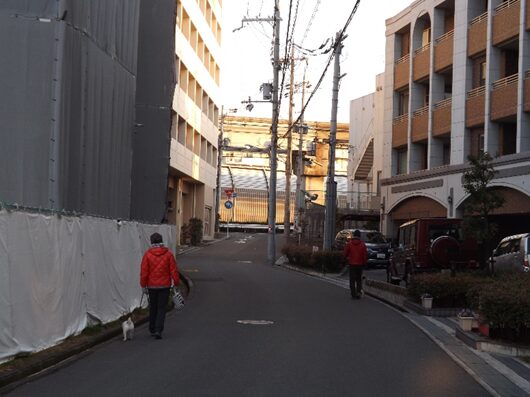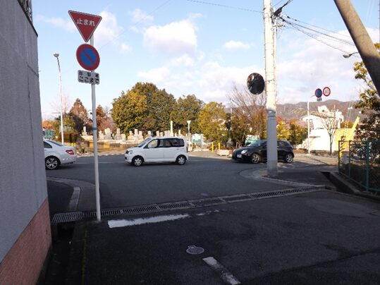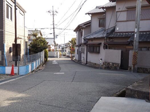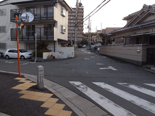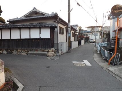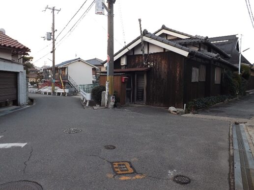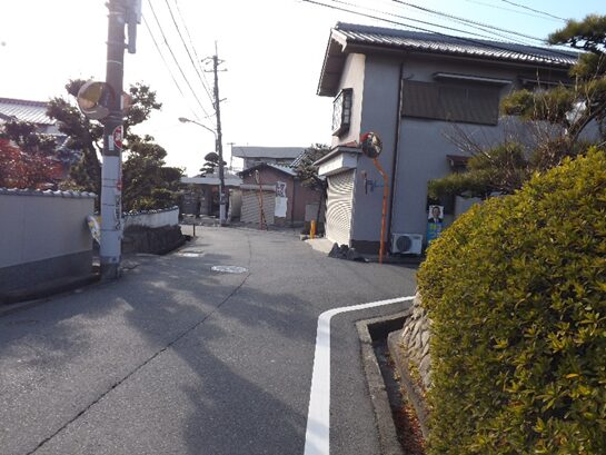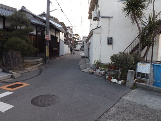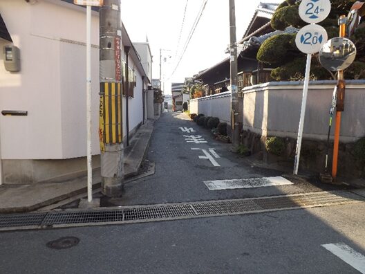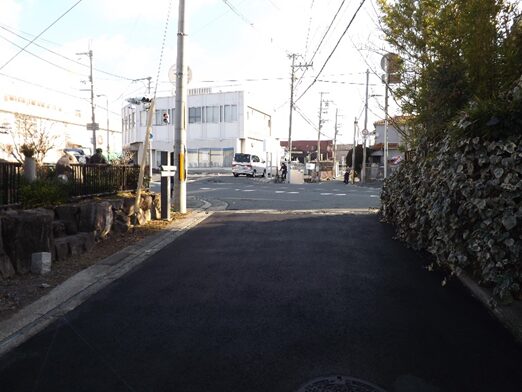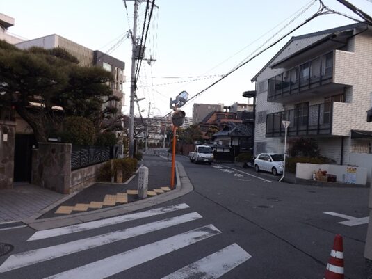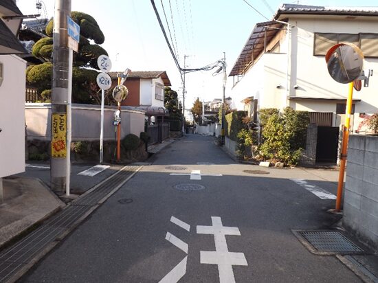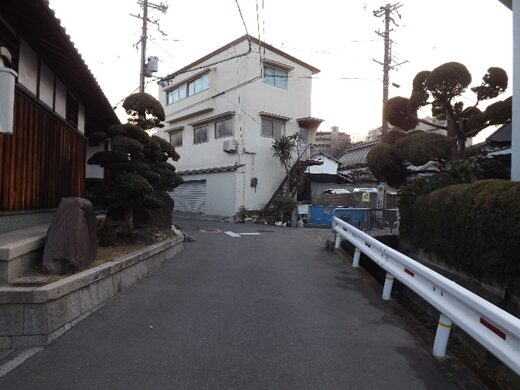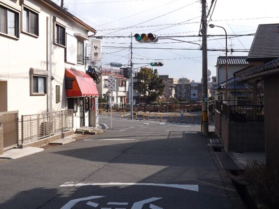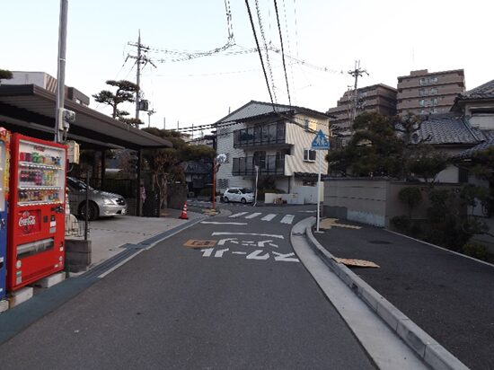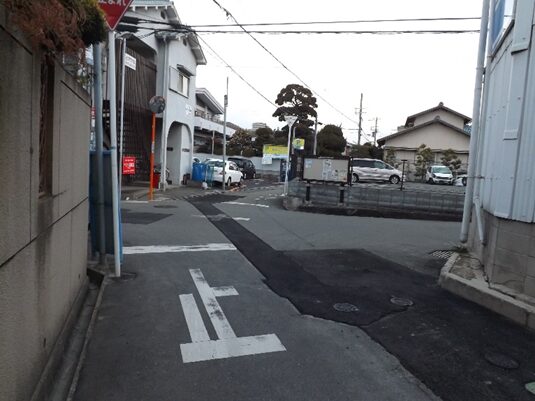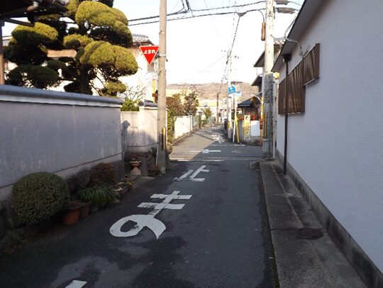 今宮4の住宅の中を200m程進むと、変則十字路に出て左に折れます