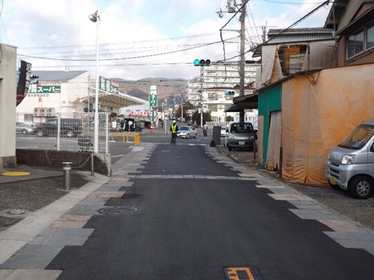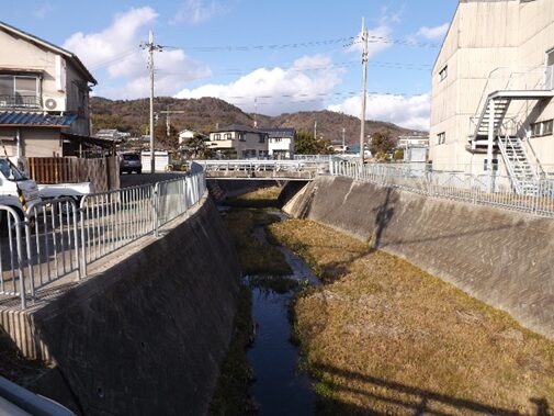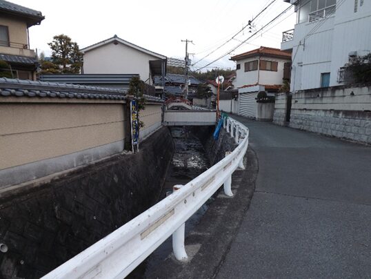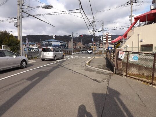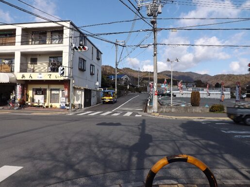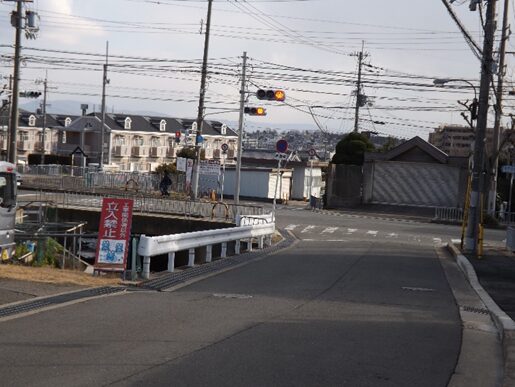 広い道の交差点、一筋手前の道を少し進む川の手前で交差点からの道と合流して橋を渡る
