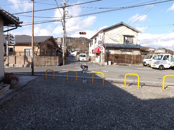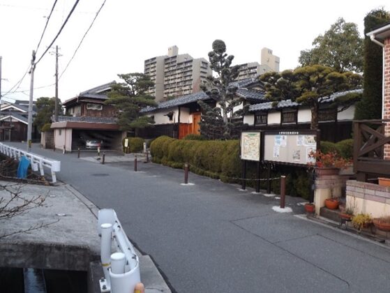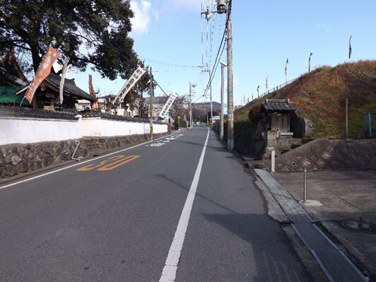 100m程進んだ先で右T字路に出ます。道も綺麗な敷石に変わります。T字路真っ直ぐ西国街道は進んでいきますが、街道はここで左に折れて別れます