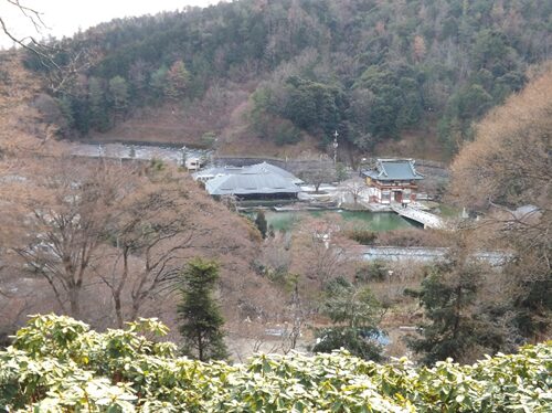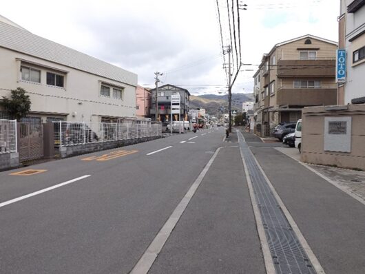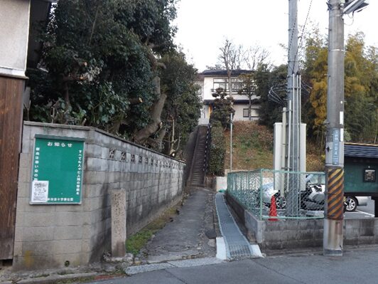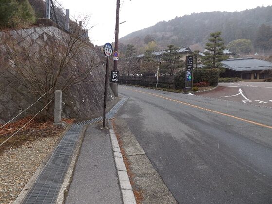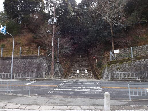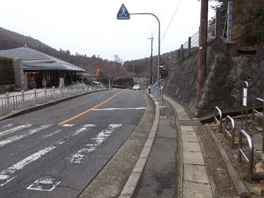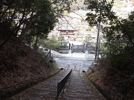 急な坂を下ると目の前に広がる。 勝尾寺階段を下りると車道が交差する