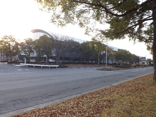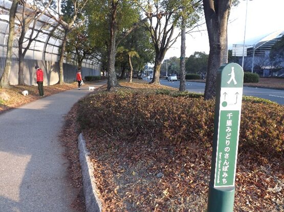 千里みどりの散歩道を北に進みます。右に千里体育館があります。もちろんこの辺りは全く旧道は残っていません