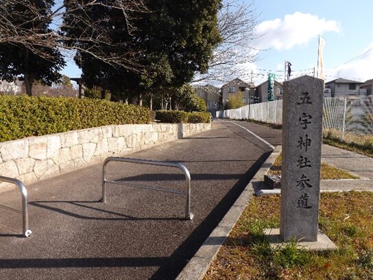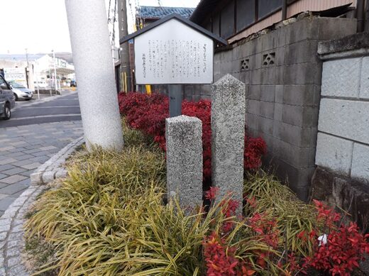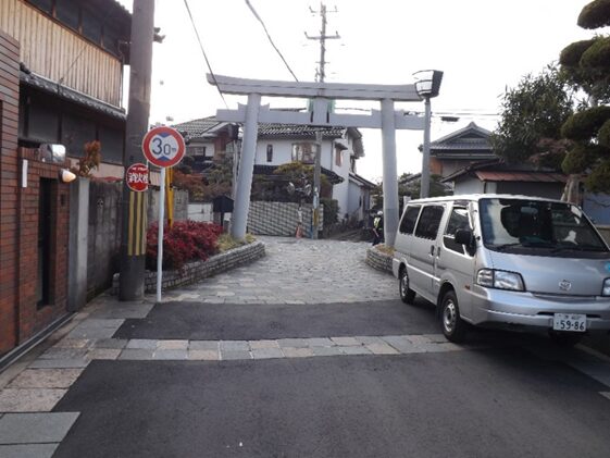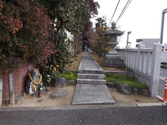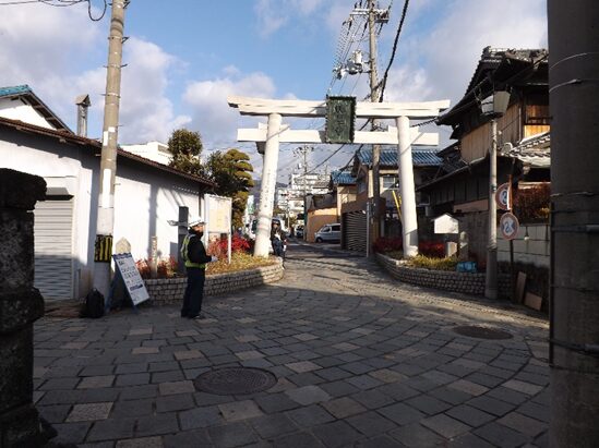 鳥居の右側に 二基の道標 栗生新家で西国街道は真直ぐ東へ分岐します
