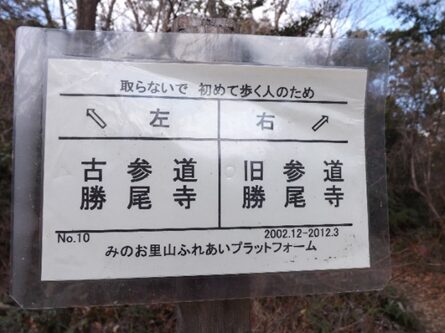 左への道は箕面滝への(車道で私は、勝尾寺の裏から開成皇子の墓に出て東海自然歩道で箕面の滝に出ました)