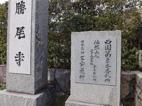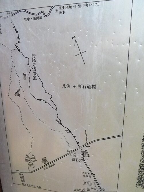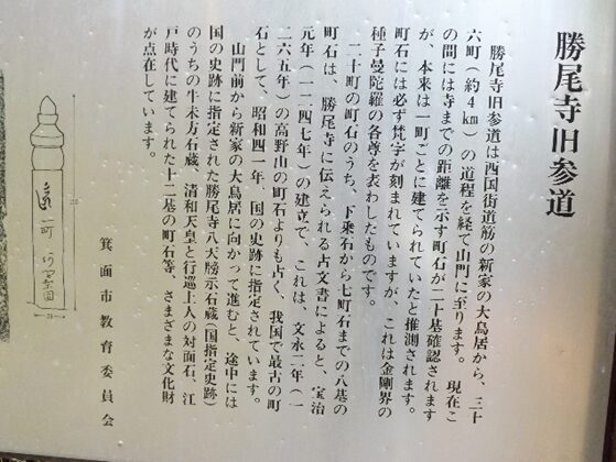 勝尾寺への幾筋もの参道の一つ表参道です。新家の大鳥居を起点として北へ三十六町(約4㎞)の道。参道には町石が残されている、最古の町石は宝治元年(1247)のものです。大鳥居は寛文六年(1666)の建立でそれ以前に木の鳥居として鎌倉時代の寛元三年(1245)に建てられたと記録に残る