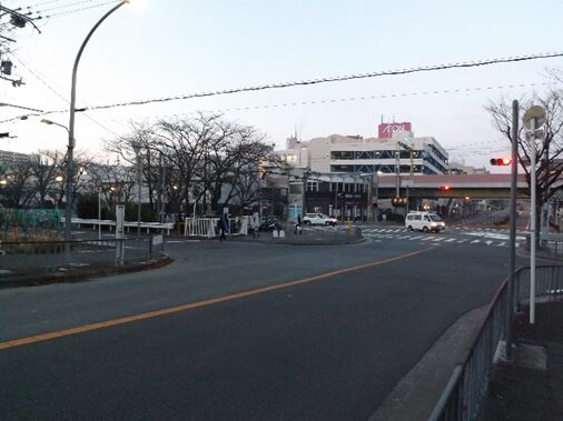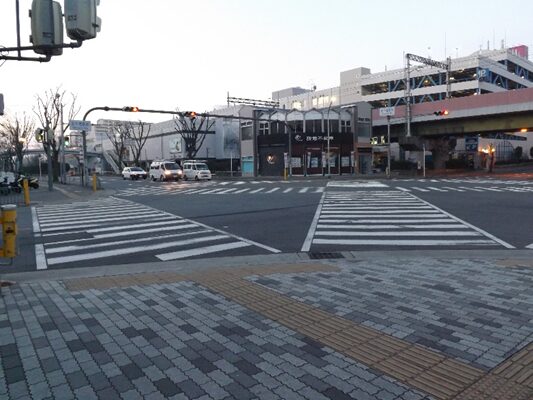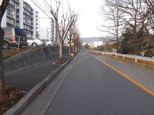 右に東図書館を見て公園を過ぎた、その先栗生団地前南の交差点で左から道が合流して右にカーブして進みます
