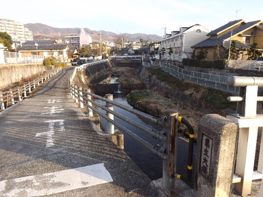 少し【寄り道】をして、交差点を右に行くと勝尾寺川に架かる栗生大橋に出て、橋から北側を見たところ