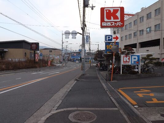 120号線を暫く北に進む、左に金蘭短大等の学校を見ながら歩いていくと、左にセブンイレブン、すぐの交差点手前右に関西スーパーを見て北へ真っ直ぐ進みます