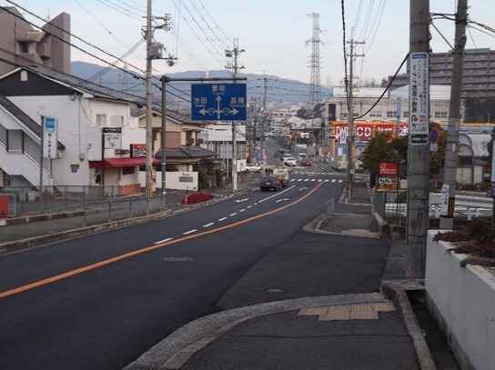 西国街道と交差する小野原南交差点が 勝尾寺街道の起点です。7時18分スタート