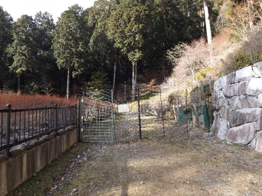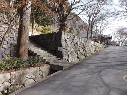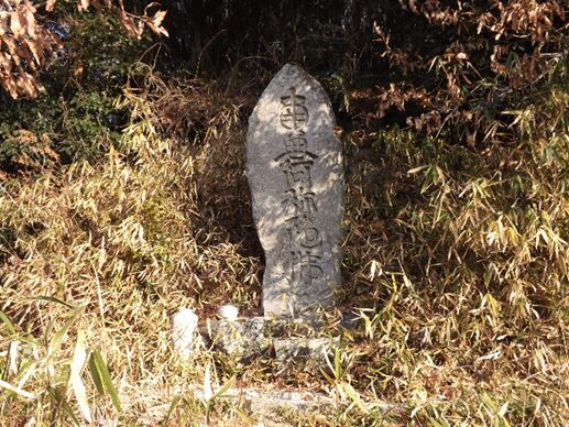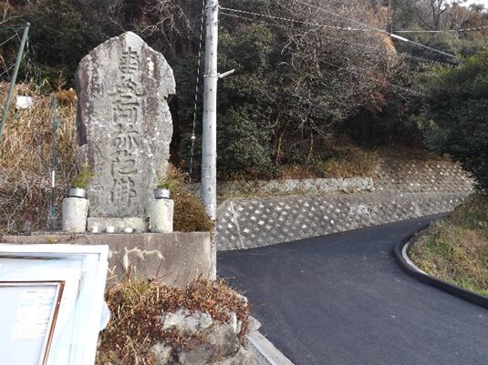 緩やかな坂を100m程上ると右にカーブします。その左角に 南無阿弥陀仏の題目碑
