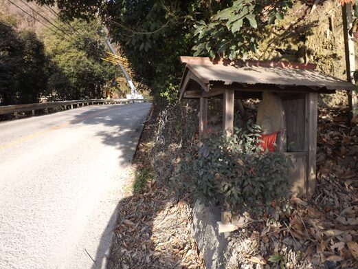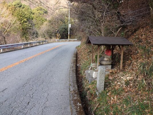 歩道がなく、くねくねした道で車も多く油断できない右に 十六丁石と地蔵